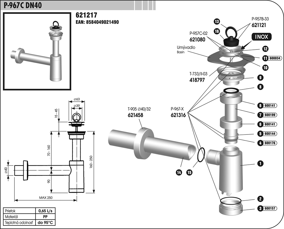 sifón umyvadlový 967C DN40 kov 621217