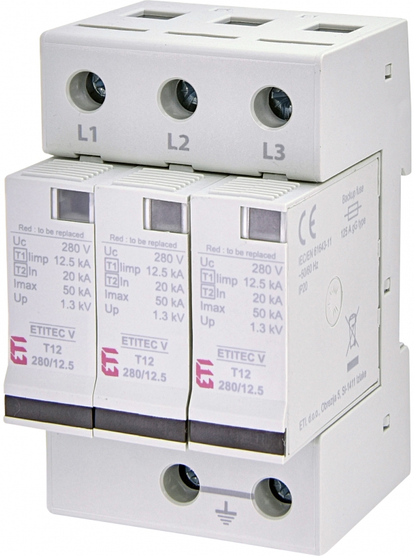 Popis: ETITEC V T12 280/12,5 3+0 Název třídy: svodič přepětí Typ: T1, T2 Provozní napětí Uc (V): 280 Impulzní proud Iimp(10/350ms) (kA): 12,5 In (8/20): 20 Max. výbojový proud Imax(8/20ms) (kA): 50 Up - Úroveň ochrany napětí (kV): <1,5 Svodový proud: Ano Aplikovaná technologie: MOV Dálková signalizace: Ne Typ sítě: TNC Počet modulů: 3 Vestavná hloubka (mm): 68 Funkce: SPD Skupina katalogu: ETITEC V